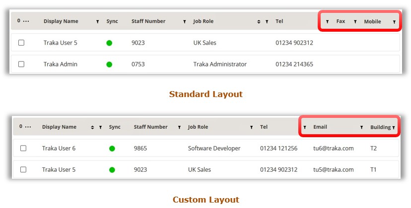 In the example below, the user is currently on the Users page. By selecting a layout that has already been saved, you can see that two of the columns; Fax and Mobile have changed and now provide information for Email and Building.