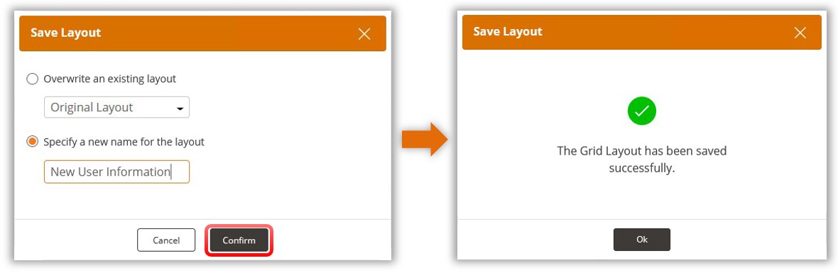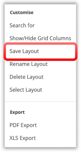 After you have customised a grid by adding, moving or deleting columns/fields, you have the option to save that selection so that you can later return to the same grid and select a pre-configured layout without having to select different columns/fields.