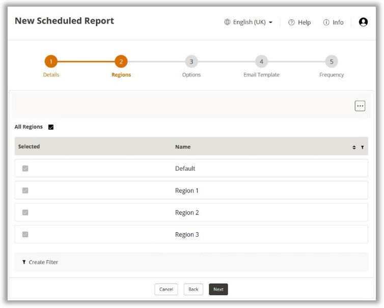 for the Scheduled Report. By default, all available regions will be