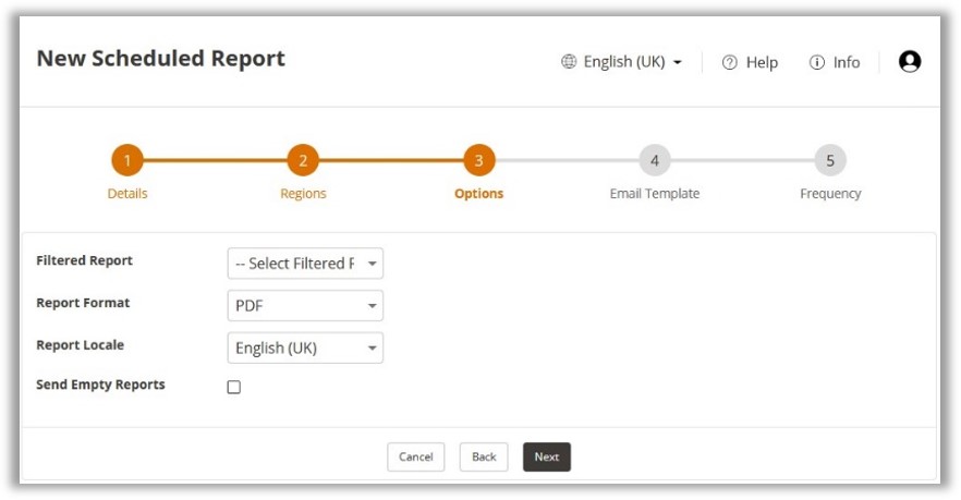Scheduled Reports can be configured separately from Filtered Reports, whilst they can be created and submitted, they will not display any information without the Filtered Report content. The configuration of Filtered Reports is divided into 5 steps.