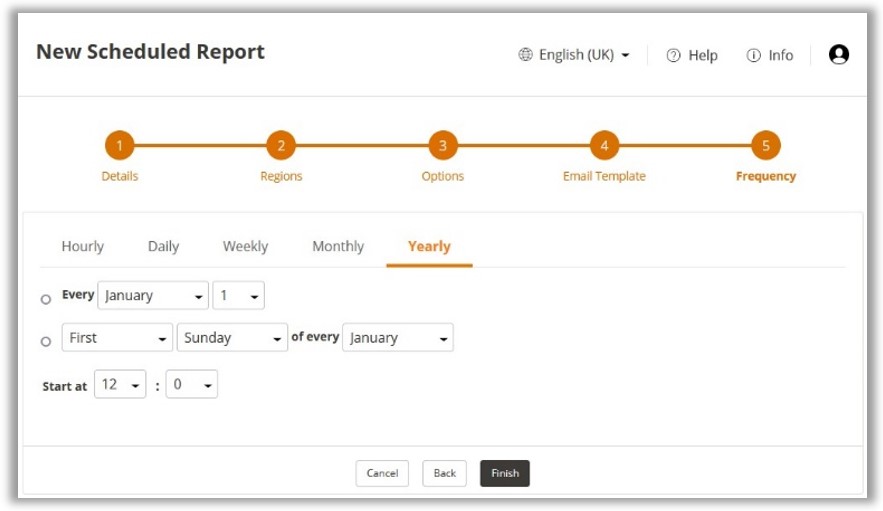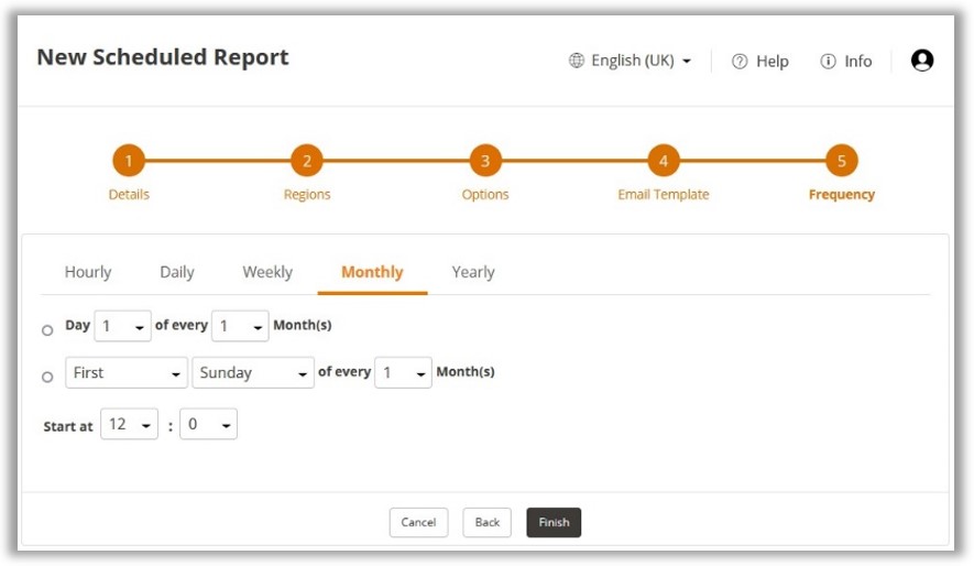 Select Day 1-31 of every 1-12 month(s) or select First-Fourth, Sunday-Saturday of every 1-12 Month(s)