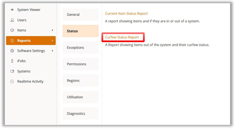 The Status Report shows all items and their system status, e.g., whether an item is in the system. The Status Report comprises of 2 report categories: